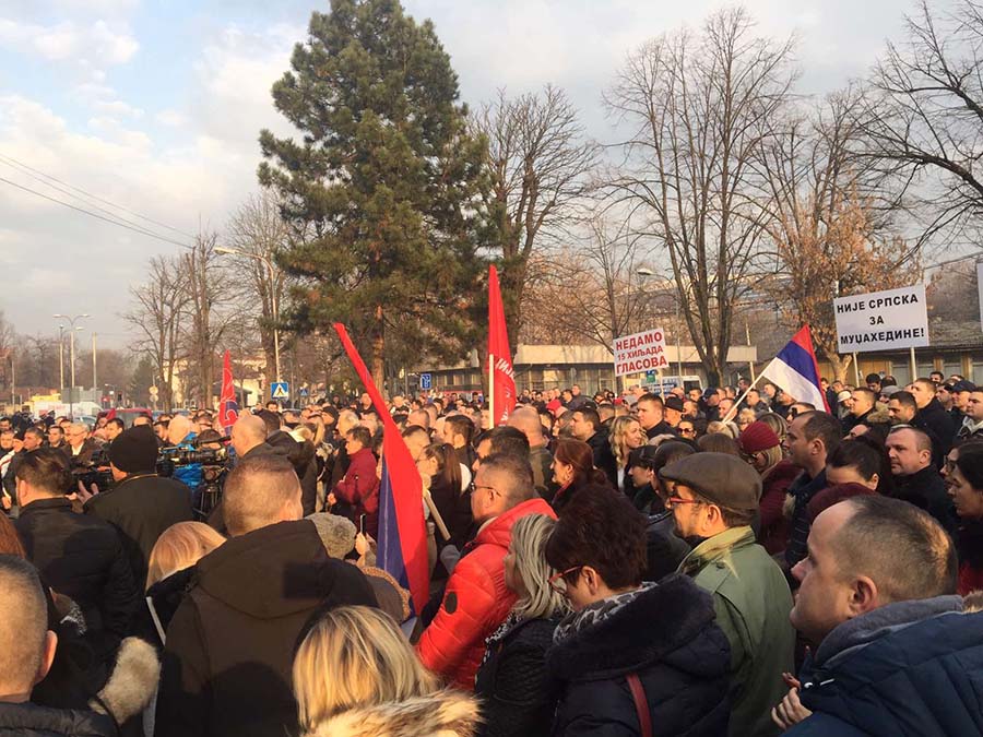 Okupljeni su nosili i transparente sa natpisima “Ne damo 15.000 glasova”, kao i onaj sa natpisaom “Ne damo Srpsku Mudžahedinima”.