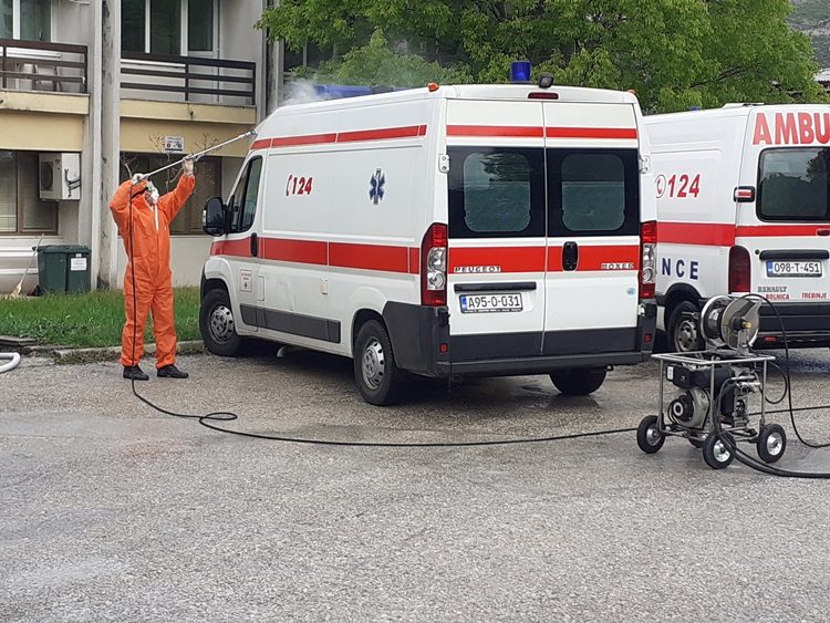Pripadnici vojnog epidemiološkog odreda juče su su izvršili dezinfekciju Doma zdravlja i Bolnice Nevesinje.