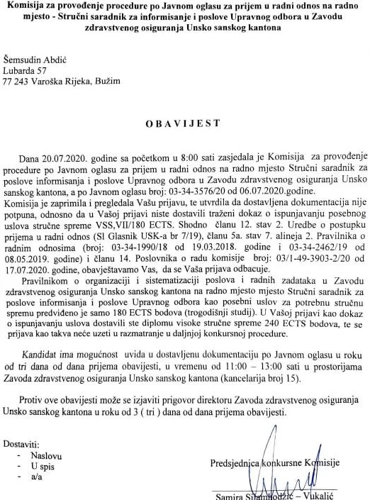 “Pravilnikom o organizaciji i sistematizaciji poslova i radnih zadataka u Zavodu zdravstvenog osiguranja Unsko – sanskog kantona na radno mjesto Stručni saradnik za poslove informisanja i poslove Upravnog odbora kao poseba uslov za potrebnu stručnu spremu predviđeno je samo 180 ECTS bodova (trogodišnji studij). U Vašoj prijavi kao dokazo ispunjavanju uslova dostavili ste diplomu visoke stručne spreme 240 ECTS bodova, te se prijava kao takva neće uzeti u razmatranje u daljnoj konkursnoj proceduri“, piše u zvaničnom obrazloženju Komisije.