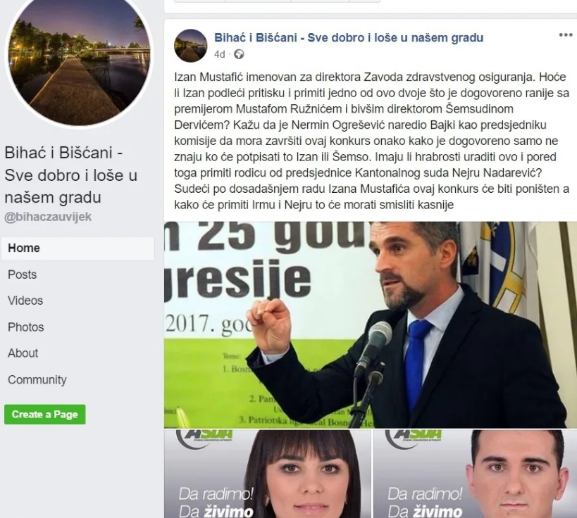 Posebno je zanimljiva objava na Fejsbuk stranici “Bihać i Bišćani – Sve dobro i loše u našem gradu”, gdje su se još ranije objavila imena i fotografije ljudi koji bi trebalo da budu zaposleni u ZZO USK, a kadrovi su stranke ASDA. Na stranici se navodi i da je jedan od “glavnih favorita” za dobijanje posla rodica predsjednice Kantonalnog suda Nejra Nadarević.