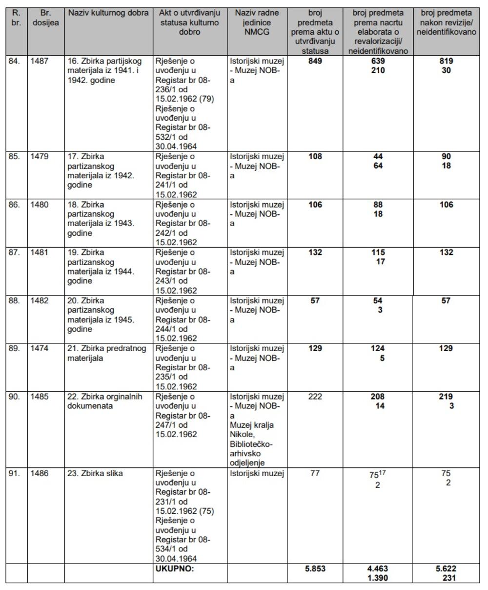 “Takođe, kontrola pristupa osoblja i korisnika muzejskog materijala i dokumentacije nije obezbijeđena na adekvatan način, odnosno ovaj važan segment muzejske djelatnosti nije u dovoljnoj mjeri organizovan u skladu sa Pravilnikom o zaštiti muzejskog materijala i muzejske dokumetancije. Državna komisija je konstatovala da dosadašnja muzejska dokumentacija nije sadržala podatke o kulturno-istorijskoj, ali ni materijalnoj vrijednosti muzejskih predmeta, te je kroz nadzor nad sprovođenjem revizije u NMCG, urađena kulturno-istorijska vrijednost, odnosno sistematizovani su muzejski predmeti na one sa statusom kulturno dobro i one koji imaju kulturno-istorijske vrijednosti, ali do sada nijesu valorizovani.