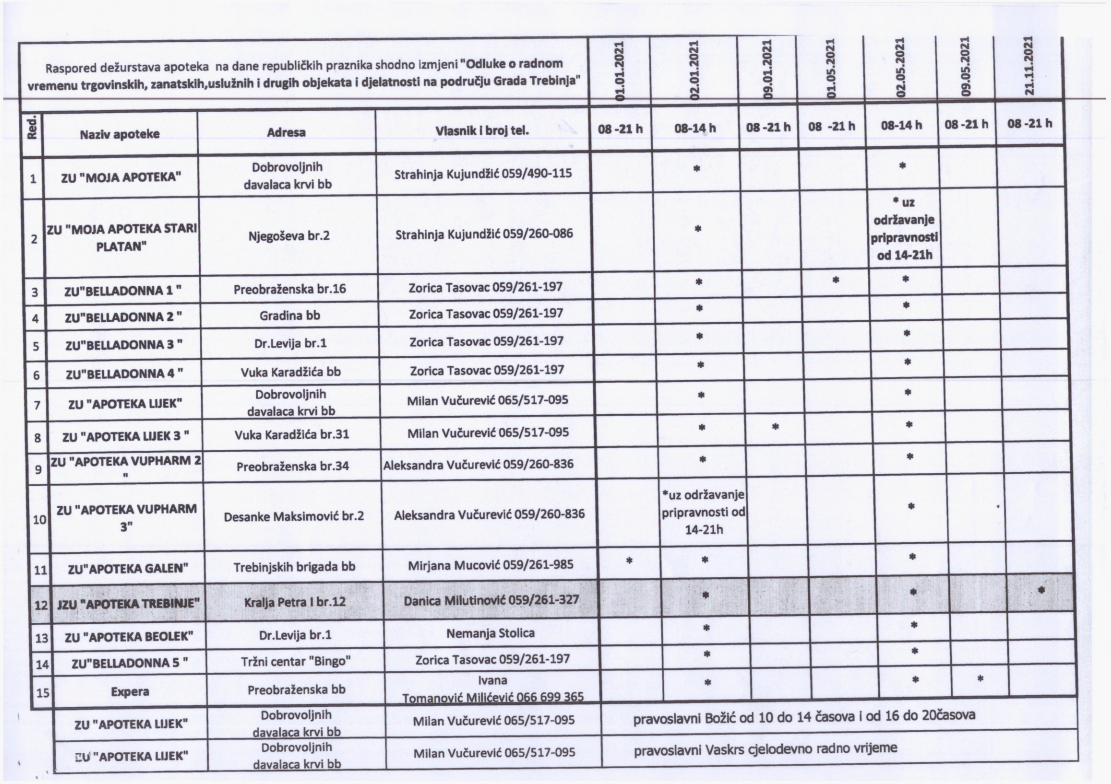 Najnovije TrebinjeTrebinje: Raspored dežurstava apoteka za praznike Postavio: eTrebinjeUtorak, 22.12.2020.0 Izvor: Fotografija: Izvor: Grad Trebinje