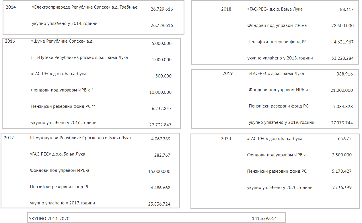 Skoro svih godina isti su uplatioci i svode se na tri preduzeća: „Gas RES“, Penzijski rezervni fond RS i fondove kojima upravlja IRB. „Elektroprivreda RS“ i „Šume RS“ u zadnjih sedam godina samo su jednom uplatili dividendu u budžet RS i to ERS 2014. godine, a „Šume“ 2016. godine.