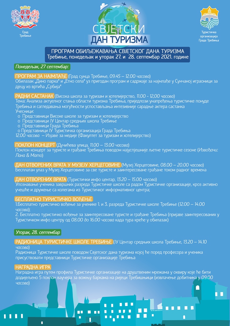 Turistička organizacija Trebinja najavila je da će uz podršku grada u ponedjeljak i utorak, 27. i 28. septembra, različitim sadržajima prilagođenim za sve uzraste obilježiti 27. septembar – Svjetski dan turizma.