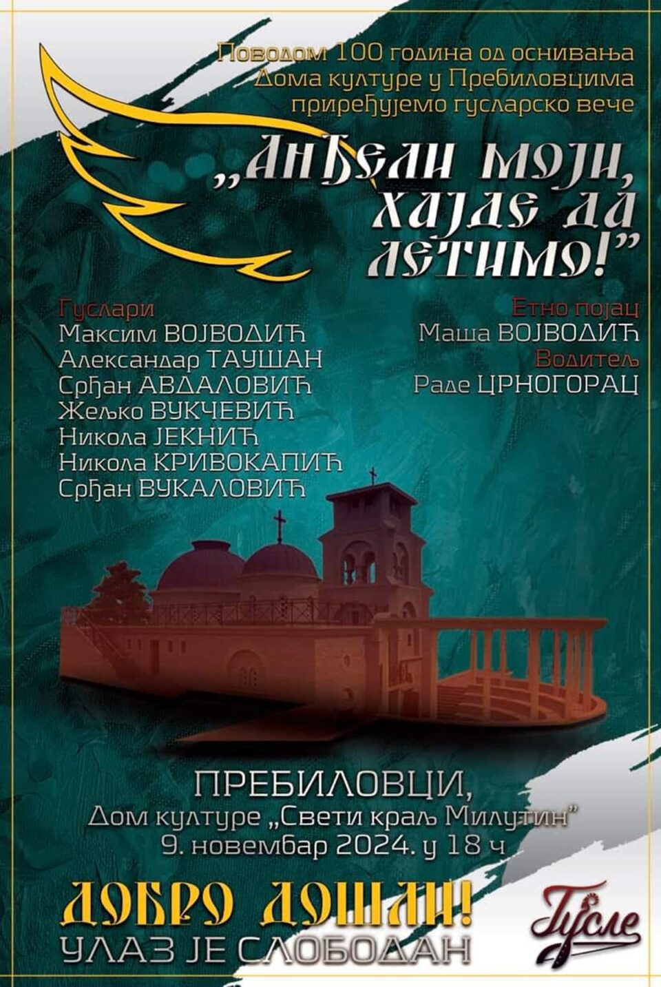 U Domu kulture „Sveti kralj Milutin“ u Prebilovcima, 9. novembra s početkom u 18 časova, održaće se guslarsko veče pod nazivom „Anđeli moji, hajde da letimo“ povodom obilježavanja 100 godina od osnivanja ove ustanove i prve škole u ovom mjestu.