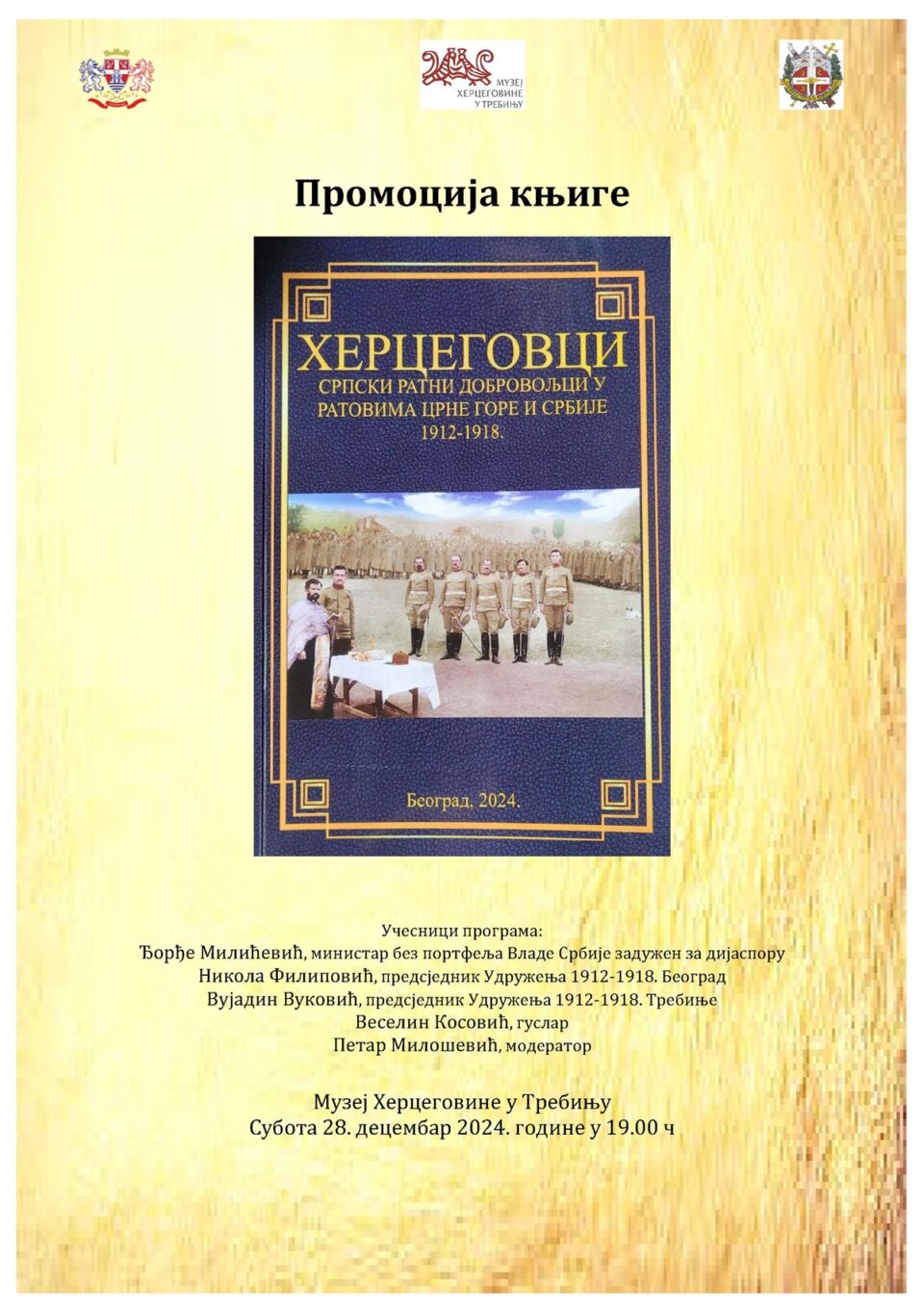 Na promociji će govoriti: Đorđe Milićević, ministar bez portfelja Vlade Srbije zadužen za dijasporu, Nikola Filipović, predsjednik Udruženja 1912-1918 Beograd, Vujadin Vuković, predsjednik Udruženja 1912-1918 Trebinje, Veselin Kosović, guslar i moderator Petar Milošević.