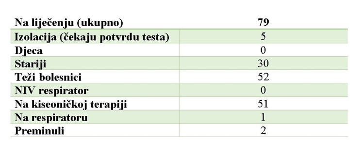 Na kovid odjeljenjima hospitalizovano je ukupno 79 pacijenta, 52 su teži bolesnici – 51 na kiseoničkoj terapiji, a jedan na respiratoru.
