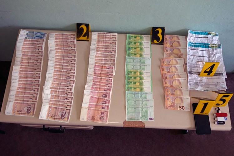 Policija je u stanu i vozilu koje koristi Fočak čiji su inicijali M.Đ. (20) pronašla 9.000 KM, više USB stikova, mobilni telefon i uplatnice za koje se sumnja da su falsifikovane i da ih je koristio prilikom pranje novca i falsifikovanja isprave, čime je stekao protivpravnu imovinsku korist od 136.000 KM.