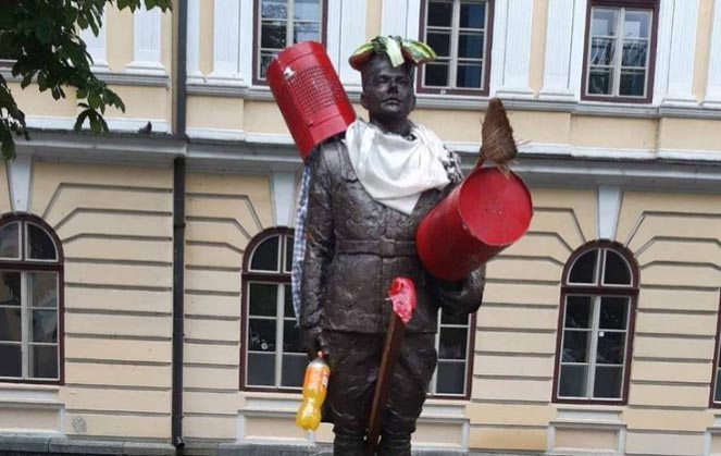 Na bronzanu skulpturu, koja predstavlja mladog srpskog vojnika iz Prvog svetskog rata, okačene su kante za smeće. Kora od lubenice stavljena je na glavu, metla pod ruku, a odeća obešena kao nekakva portikla.