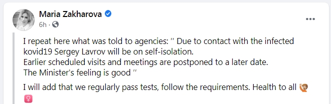 Ministar spoljnih poslova Rusije Sergej Lavrov nalazi se u samoizolaciji zbog kontakta sa osobom zaraženom virusom korona, a sve planirane posjete i sastanci se odlažu, saopštila je pres-služba Ministarstva spoljnih poslova Rusije.