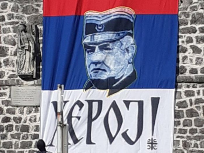 Poslije izricanja presude generalu Ratku Mladiću, na zidinama Starog Grada u Trebinju istaknuta je trobojka sa Mladićevim likom i natpisom heroj.