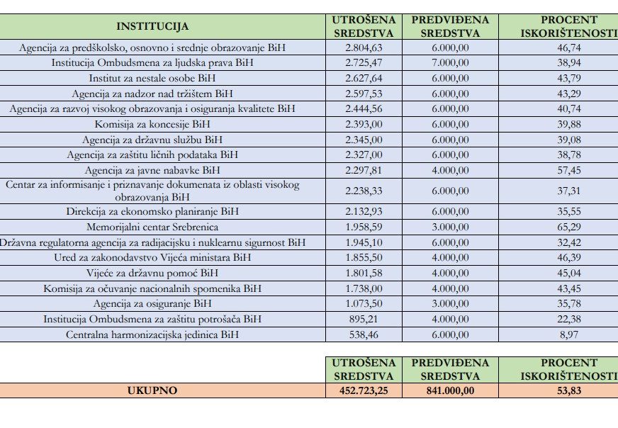 Više od 80 odsto planiranih sredstava potrošili su Odbor državne službe za žalbe, odnosno od dozvoljenih 4.000 KM potrošili su 3.977. Zatim Arhiv BiH, koji je potrošio 2.975 KM od planiranih 3.000 maraka, odnosno 99,19 posto. Agencija za forenzička ispitivanja i vještačenja čak je prekoračila limit i od dozvoljenih 6.000 KM potrošila 6.650 maraka.